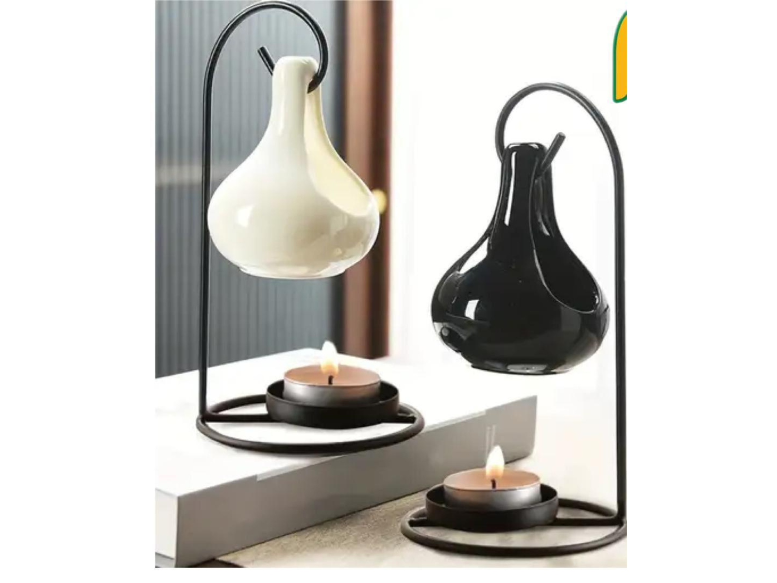 Ce diffuseur d’arômes élégant est conçu en céramique raffinée et monté sur un support métallique incurvé qui permet de maintenir la jarre suspendue au-dessus d’une bougie chauffe-plat. Le principe est simple : la chaleur douce de la bougie réchauffe le contenant, permettant de diffuser délicatement les huiles essentielles ou les senteurs parfumées dans votre espace. Parfait pour le salon, la chambre ou un bureau, il apporte une touche décorative moderne tout en créant une ambiance relaxante et chaleureuse. Disponible en deux variantes : blanc crème et noir brillant.